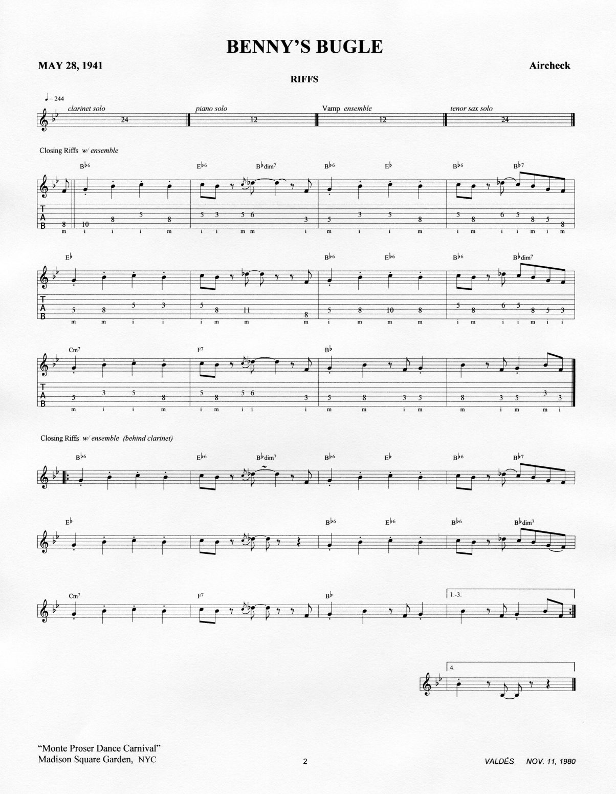 The transcription (without tab) of the last four choruses of riffs is