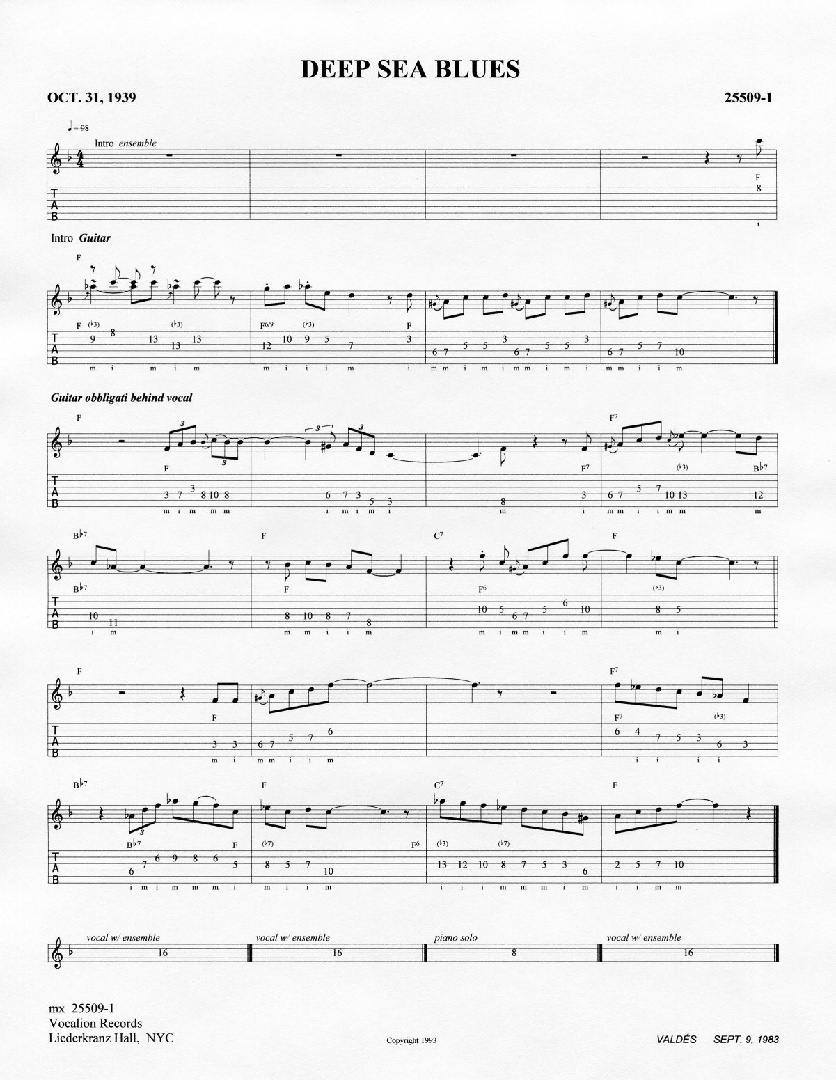 Deep Sea Blues was the first song to lead off two Vocalion recording sessions held on Halloween Day featuring blues singer Ida Cox.  This morning session was held at Liederkranz Hall in New York City.  The two takes of this blues are arranged with Charlie Christian leading on four bars of the intro and then providing single-string background behind the first sixteen bars of the vocal.  And he makes a splendid contribution on both; but that’s about the most he waxes on any one song on the day.  He is prominent on some of the other songs (all are slow blues) but not quite as much as on this one.